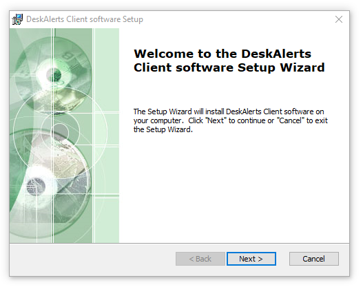 Run the DeskAlerts Agent installer (.msi) file. The DeskAlerts Agent Setup Wizard welcome screen will appear. Click Next to continue.