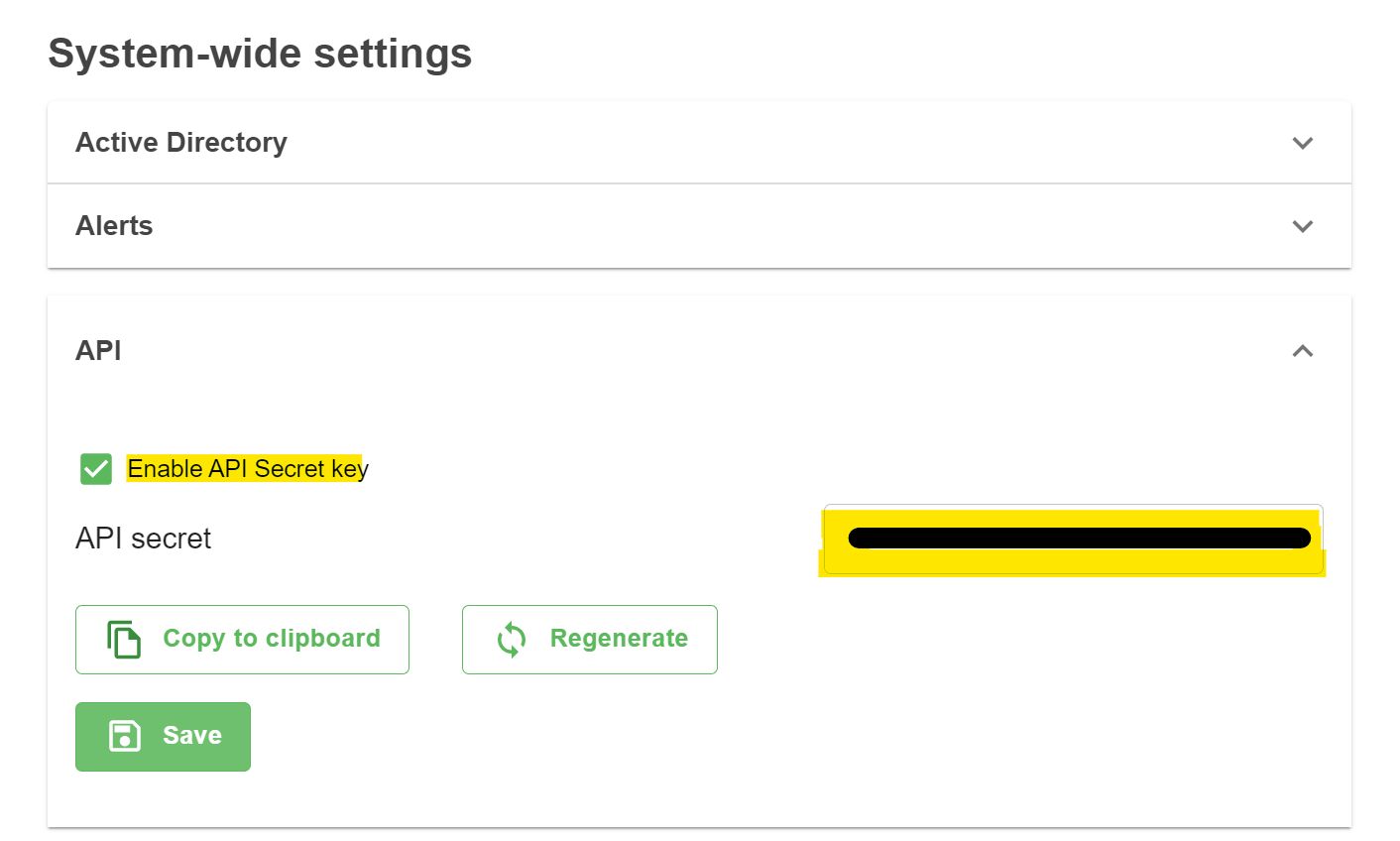 API secret key authentication is available in versions 11.4.0.2 and above. If your DeskAlerts server version is older, please use Admin/publisher credentials authentication method or update your server to the latest version. To get the API secret key to go to Settings > API, click checkbox for "Enable API Secret key" option and click save. After this copy the API secret from the API secret field.