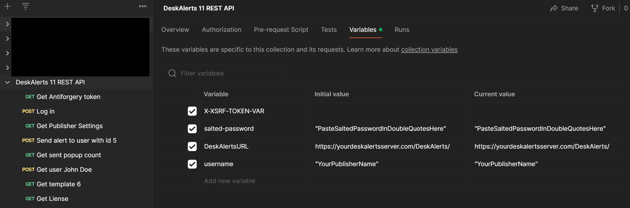 Open the collection variables tab and replace the placeholder values of variables username, salted-password and DeskAlertsURL with your actual values: