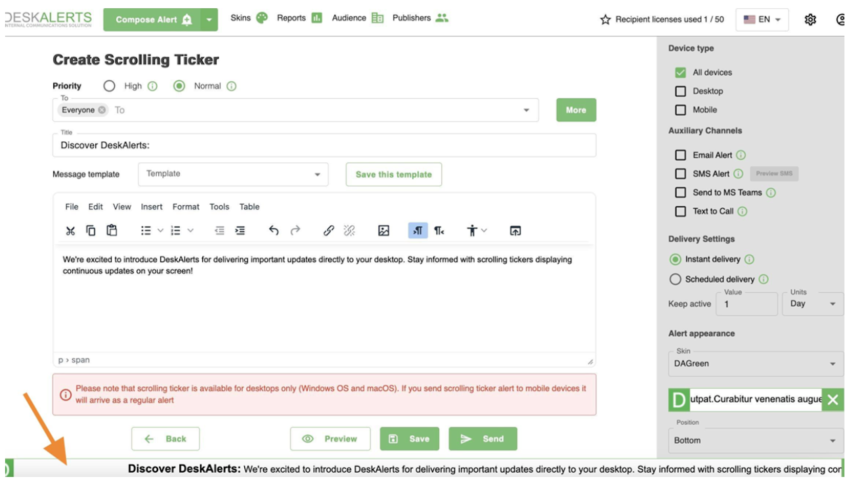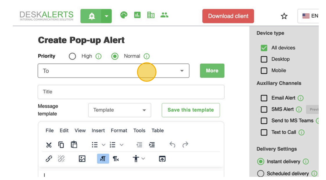 Create and send alerts that appear within seconds on the DeskAlerts Desktop Agent for your selected audience. -
