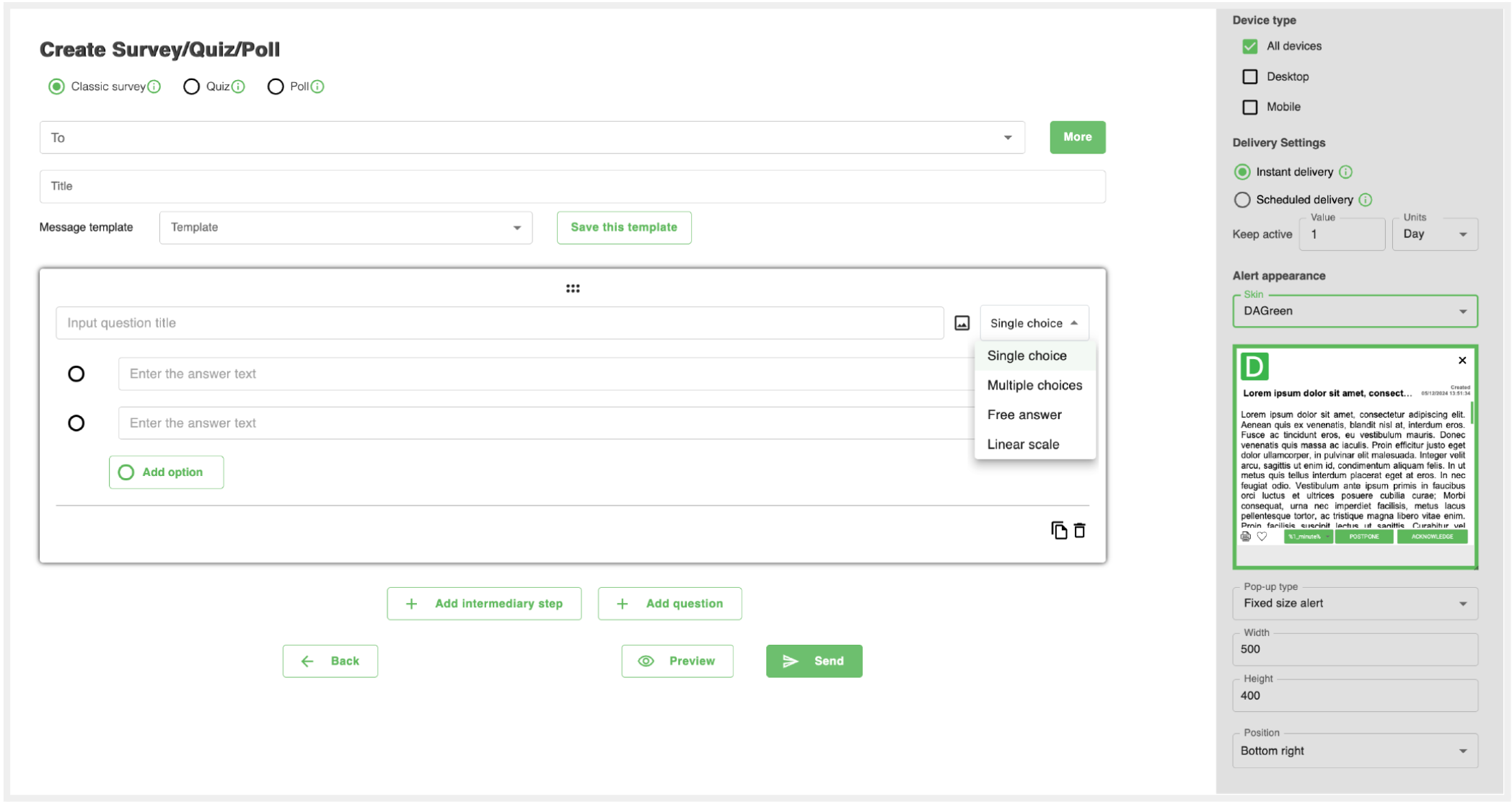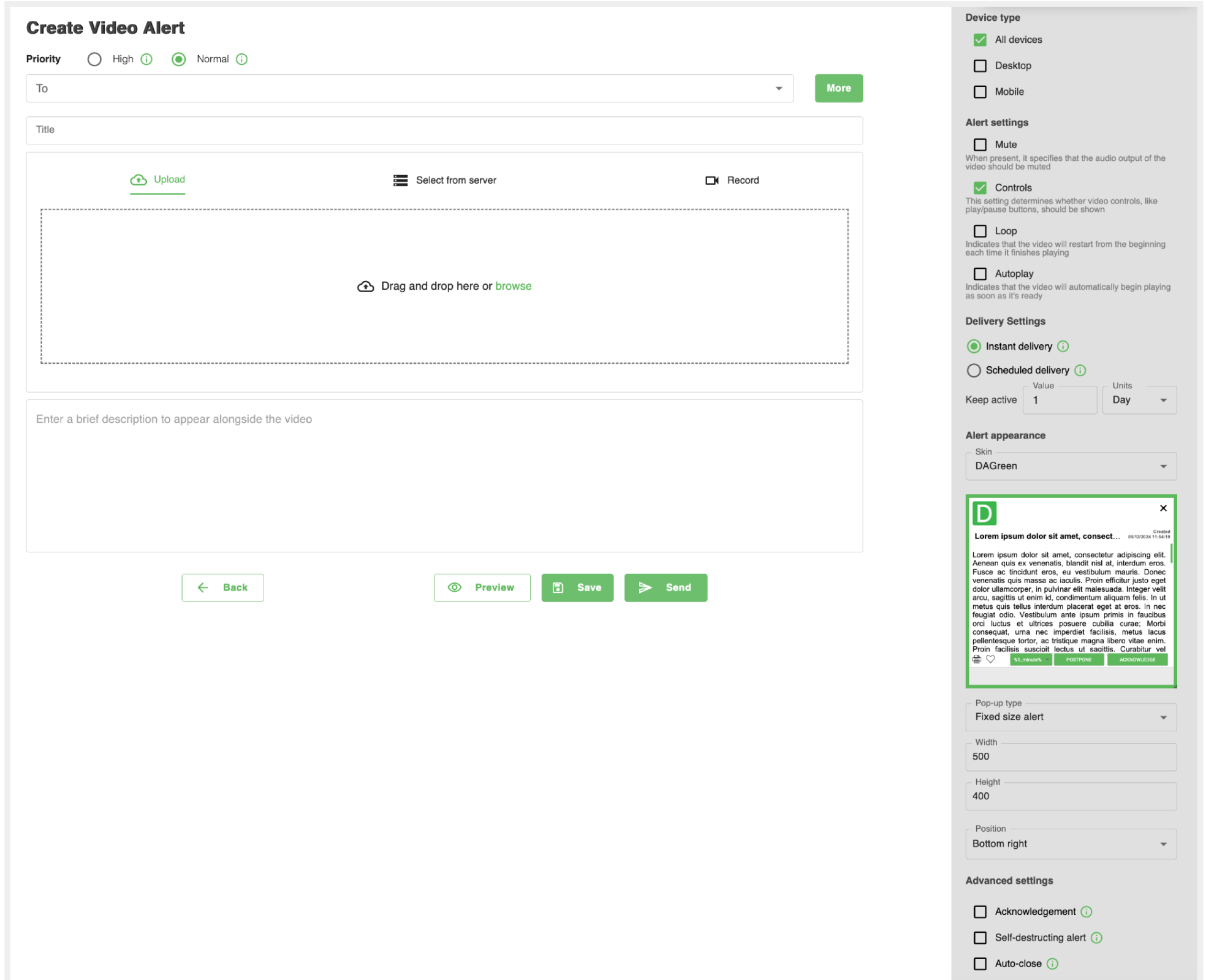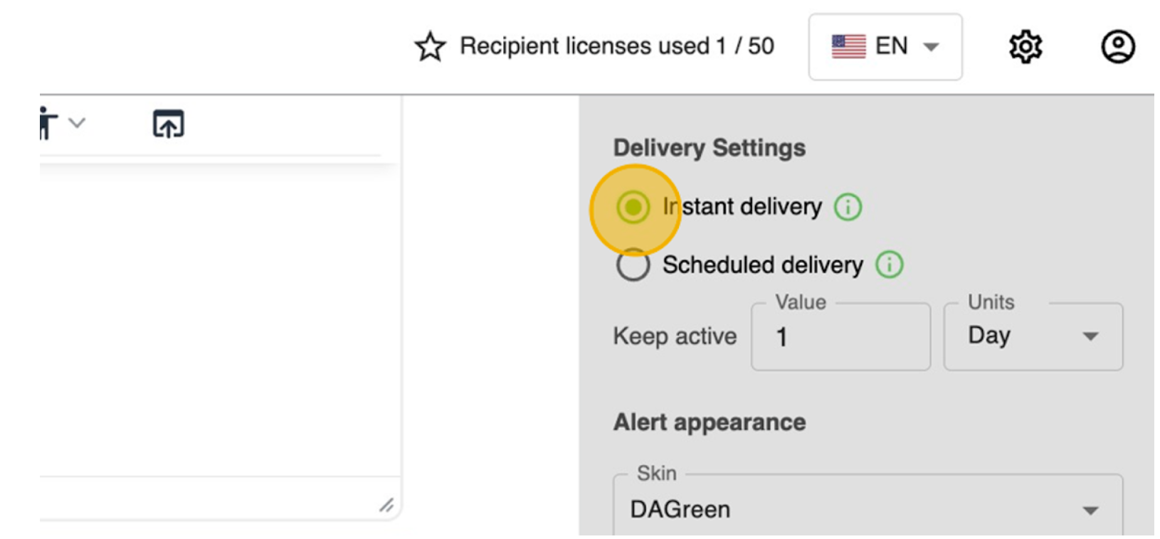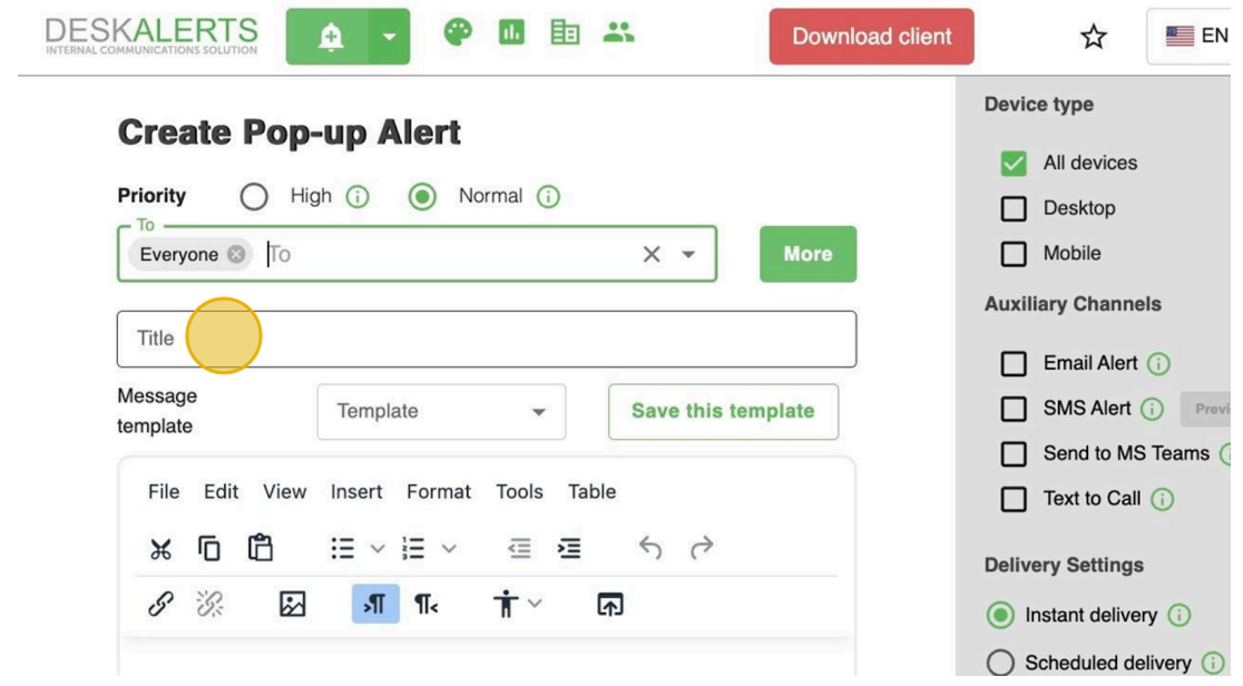 By clicking this button, you are taken directly to the page for creating a Pop-Up Alert. This is the quickest and easiest way to send urgent notifications to your audience.
