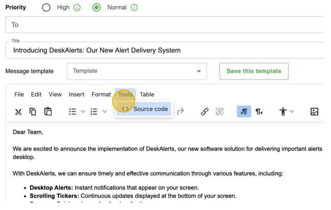 - HTML: Use the built-in DeskAlerts editor to add text, images, or fully customized HTML content.