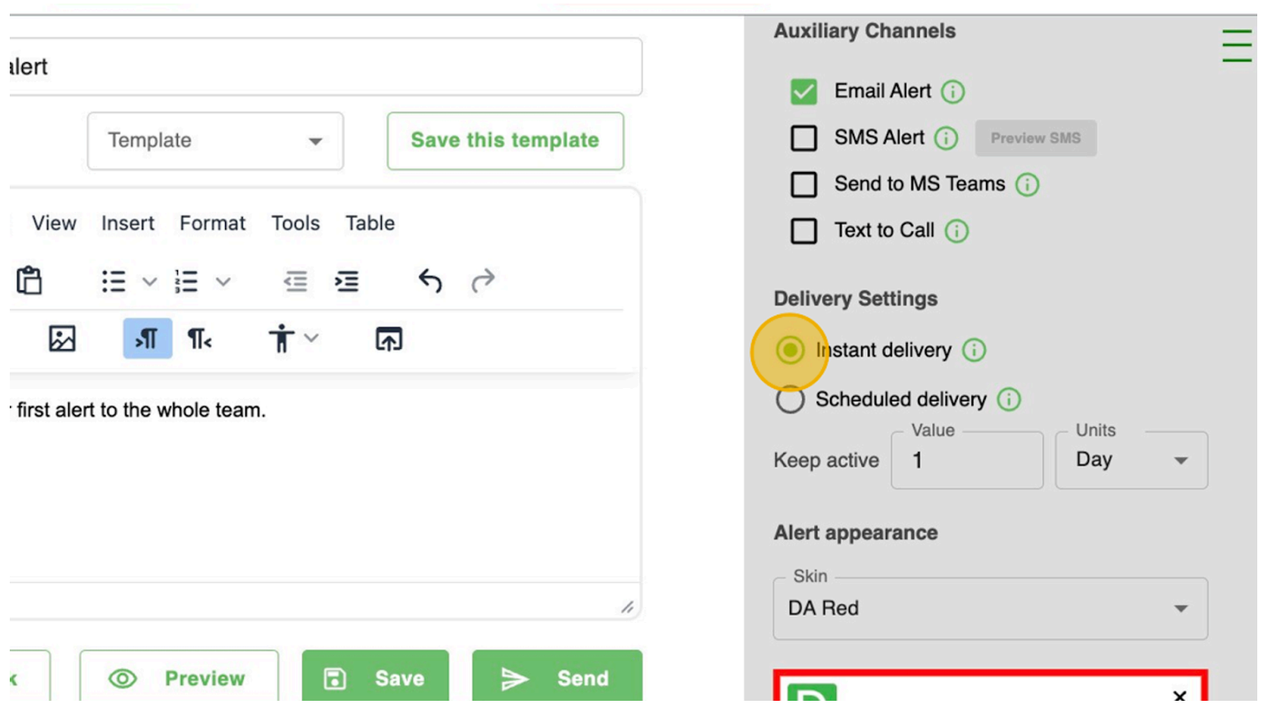 - Preview the alert to see how it will appear when triggered.