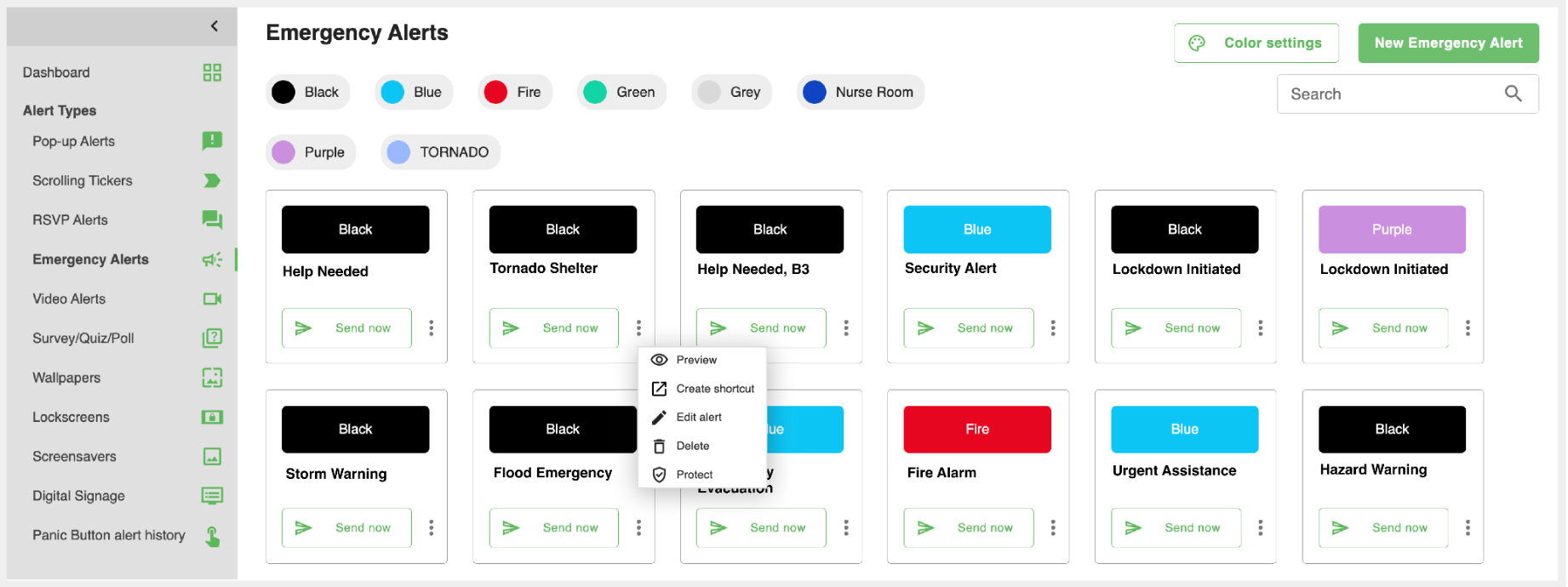 Once an Emergency Alert is created, it is displayed on the Emergency Alerts page as a card. Each card’s background color corresponds to the color code selected during the alert's creation, providing a quick visual identifier for the type or priority of the alert.