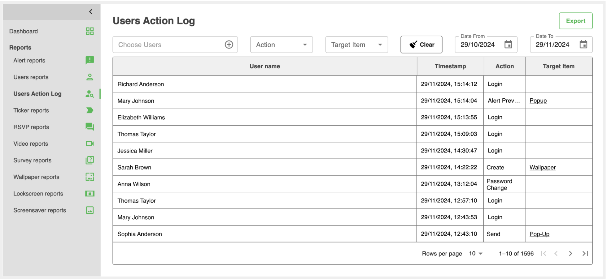 You can filter by specific users, action types (e.g., "Login" or "Send"), target items (e.g., "Pop-Up" or "Wallpaper"), and date ranges, making it easy to find the exact information you need.